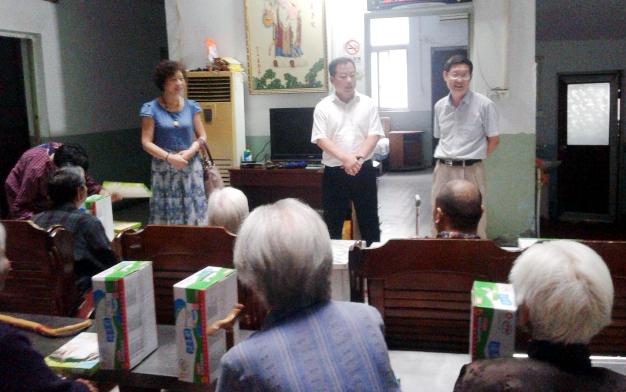 大家冒著淅淅瀝瀝的小雨,帶著對老人們親切的問候,歷時近兩個小時車程來到了黃河岸邊的“姐妹敬老院”。聽說省、市注協領導要來看望他們,老人們都非常激動,有很多平日很少下樓的老人都紛紛下樓迎接我們。大家給老人們帶去了牛奶和T恤。而且對于一些行動不便、不能下樓的老人,大家紛紛把禮物送到了他們的房間。老人們緊緊握著我們的手,雖然口頭沒能表達,但從老人們的目光中我們已經深深領會到了他們內心的感激之情。據養老院崔院長介紹,養老院是在自家宅基地上建成,共有五層,最初由其姐妹三人合開,故起名“姐妹養老院”,目前已經歷經了八年的風風雨雨?,F有五十多位老人,最高的已有九十五高齡,最年輕的也有六十幾歲,老人們紛紛表示在這里很開心,得到了較好的照顧。隨后省、市注協的領導也紛紛做了講話,祝愿老人們在這里能夠吃好、住好、過得開心!