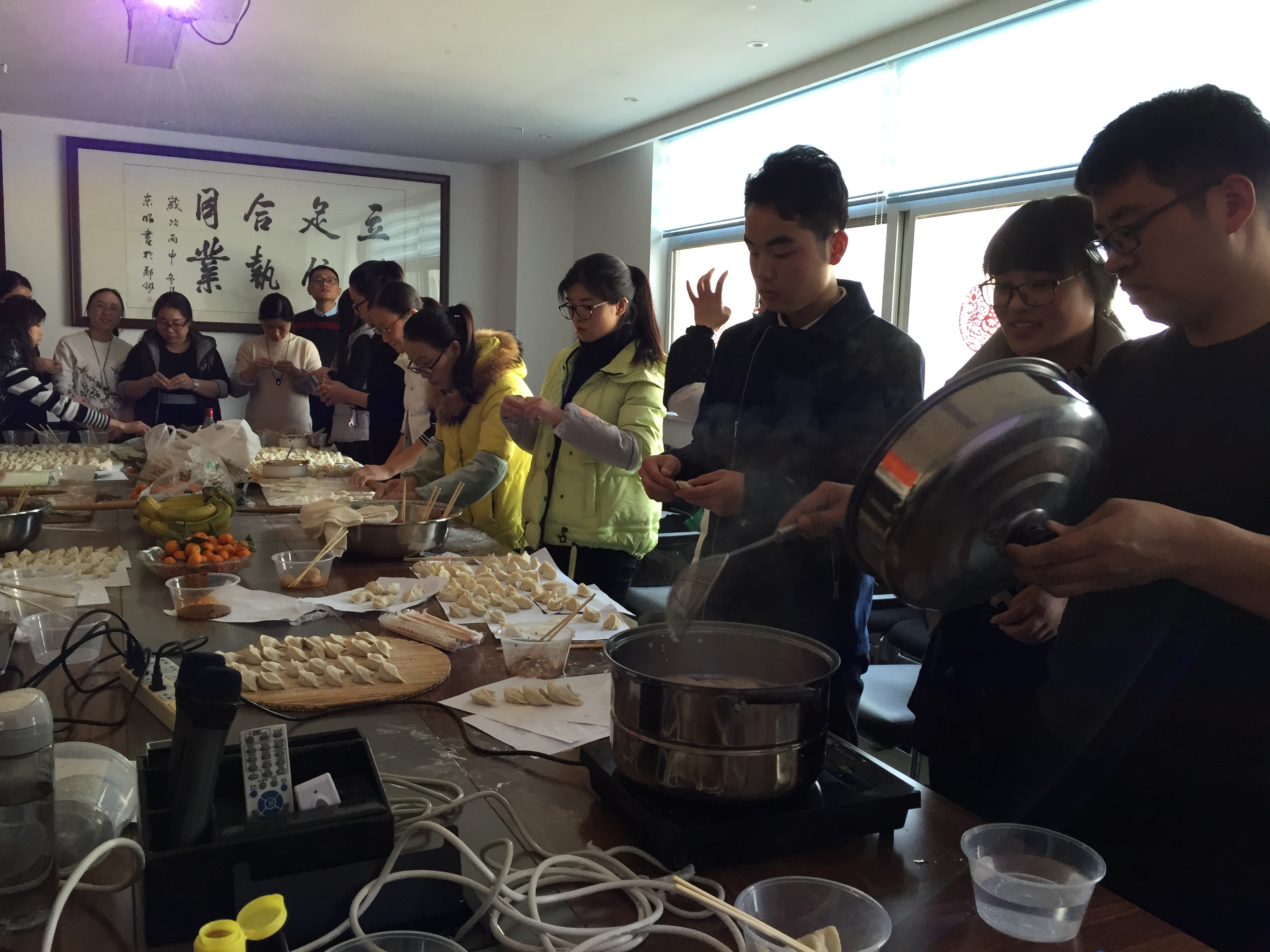 兩個(gè)小時(shí)之后,只見(jiàn)滿滿一桌包好的餃子。這是所有員工齊心協(xié)力的成果,大家的臉上都洋溢著快樂(lè)滿足的笑容。“下餃子嘍!”大家伙兒總算可以吃上自己包的餃子了,一鍋又一鍋,香味四溢。大家交談著,玩笑著,吃著玩著,今年的耳朵不會(huì)凍掉了!