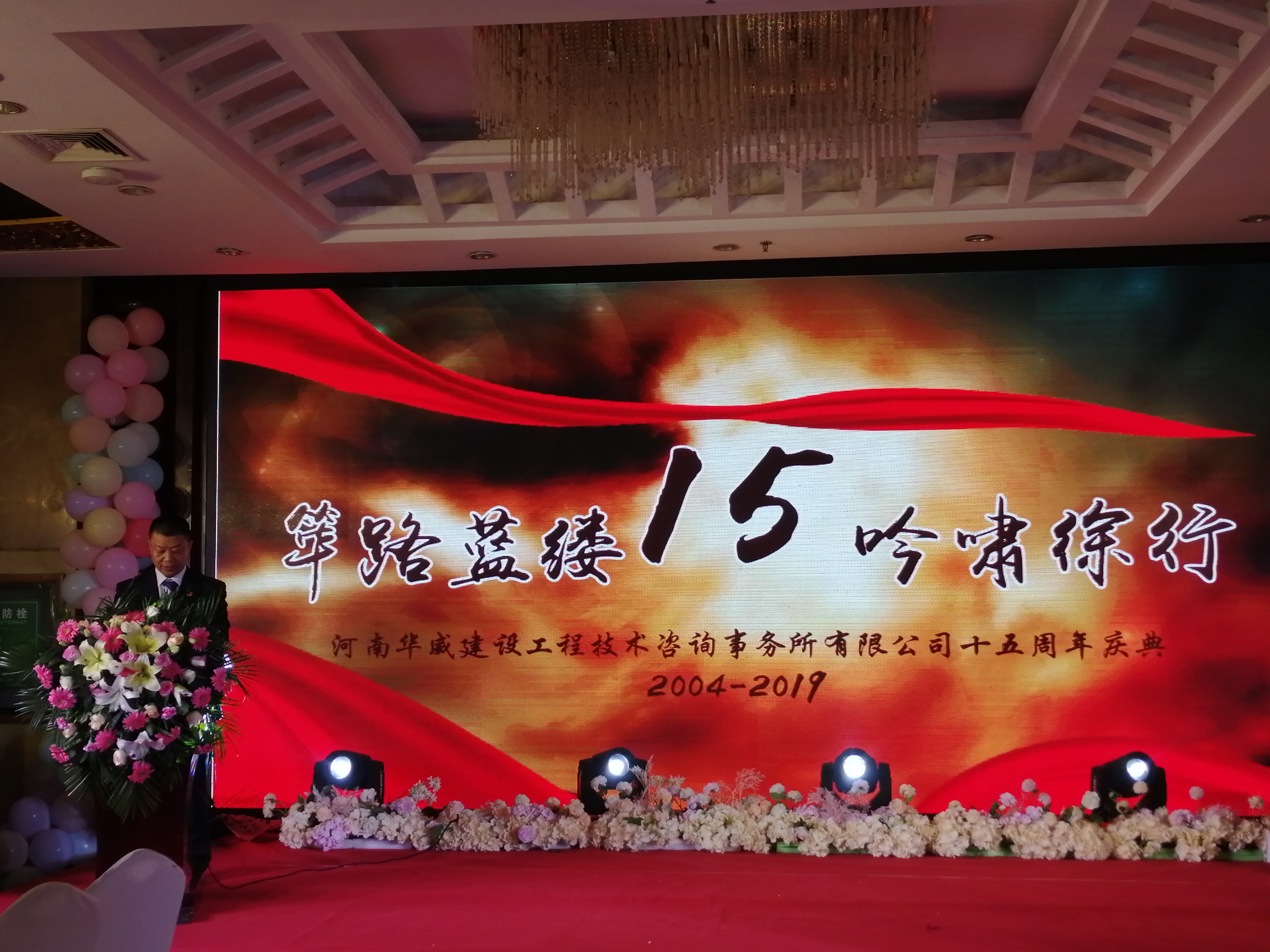 2019年10月19日,河南華威十五周年慶典活動在鄭州鷹城鑫地飯店隆重舉行,本次慶典活動以“篳路藍縷、吟嘯徐行”為主題,全體員工及特邀嘉賓親臨現場,共慶公司華誕。慶典活動內容有:總經理致辭、節目表演、游戲抽獎、慶典晚宴等,進行了一場獨具華威特色的15歲“生日盛宴”。